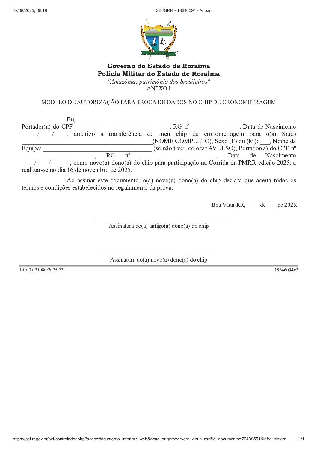 ANEXO I – MODELO DE AUTORIZAÇÃO PARA TROCA DE DADOS NO CHIP DE CRONOMETRAGEM (SEI nº 19386782);