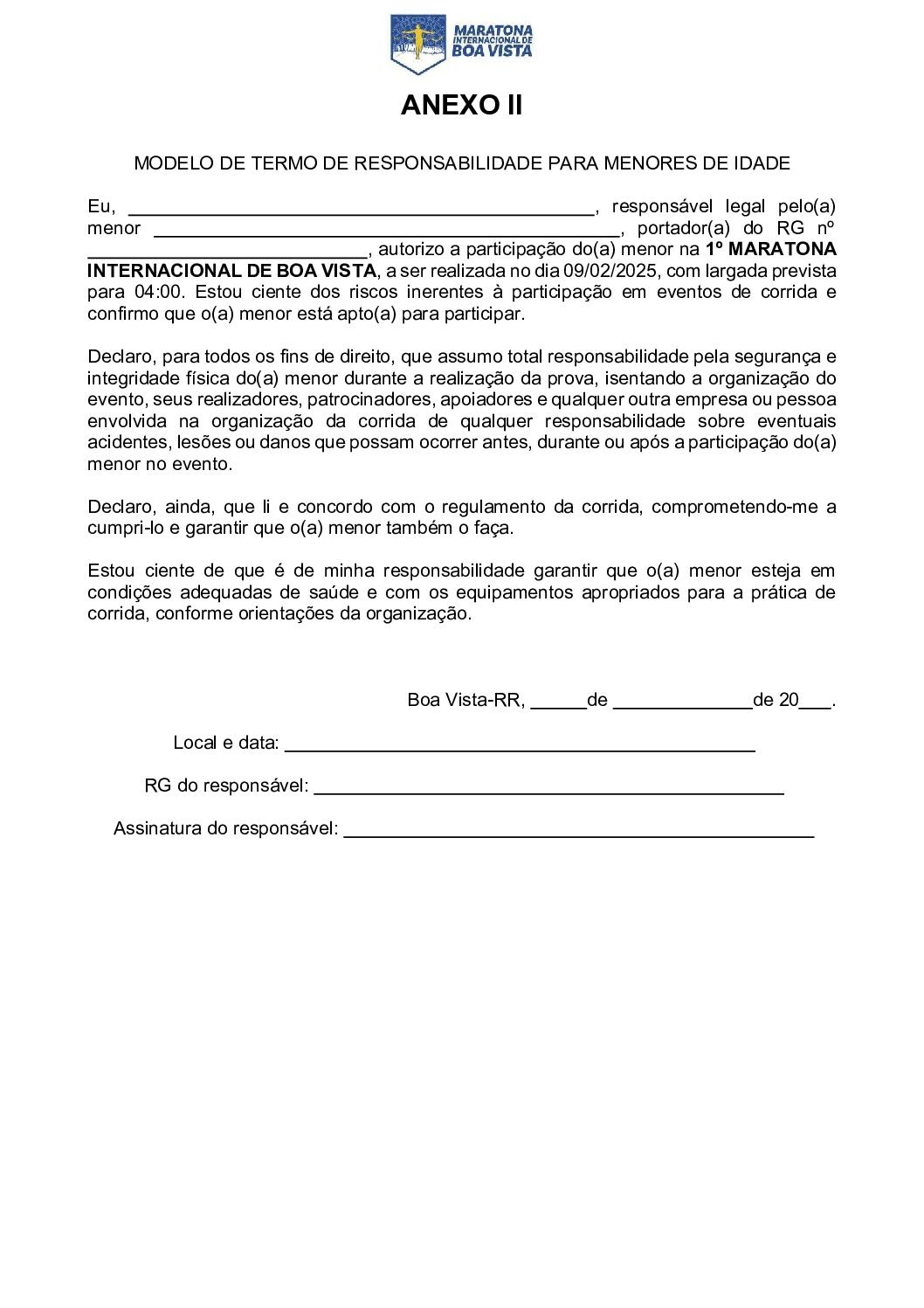 e) Menores de idade (16 e 17 anos) poderão participar da prova desde que apresentem uma autorização por escrito e assinada pelos pais ou responsáveis legais no momento da retirada do kit de corrida. A autorização deve estar acompanhada de uma cópia do documento de identidade do responsável que assinou o termo. Recomenda-se que menores de idade participem acompanhados por um adulto responsável, que também deve estar inscrito na corrida. Os pais ou responsáveis legais dos menores de idade devem assinar um termo de responsabilidade, ANEXO II deste regulamento. isentando a organização do evento de quaisquer responsabilidades por acidentes ou incidentes que possam ocorrer durante a prova;