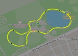c) Os atletas iniciarão a prova no Portal 1, localizado a cerca de 736,80 metros à frente do Portal 2. A primeira volta será do Portal 1 ao Portal 2, totalizando 1.788,60 metros percorridos. Em seguida, deverão completar 16 voltas completas ao redor do Portal 2, acumulando mais 40.406,40 metros. Somando-se a volta inicial e as voltas completas, o percurso totalizará exatamente 42.195 metros, garantindo conformidade com a distância de uma maratona.