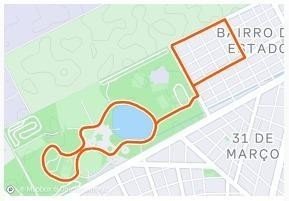 b) A maratona será realizada em um percurso dentro do Parque Anauá, com o trajeto em sentido anti-horário, conforme detalhado no mapa abaixo. Cada volta completa tem aproximadamente 2.525,40 metros. Para atingir a distância oficial de 42.195 metros, o percurso contará com dois pontos estratégicos: o Portal 1 (largada) e o Portal 2 (principal/chegada).